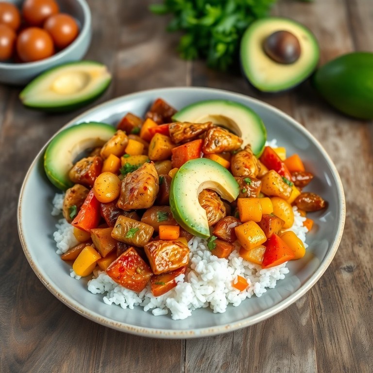 Un delicioso plato de pollo salteado con verduras frescas y arroz, ideal para una comida nutritiva y sabrosa.
