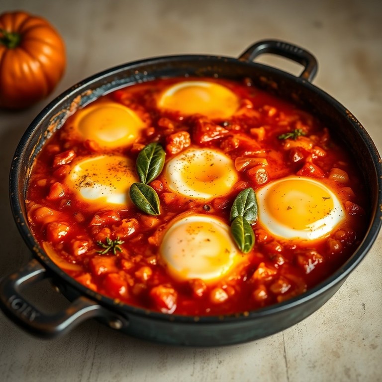 Un delicioso plato de huevos cocinados en una salsa de tomate y cebolla, con un toque de cúrcuma y laurel, ideal para un desayuno o almuerzo nutritivo.
