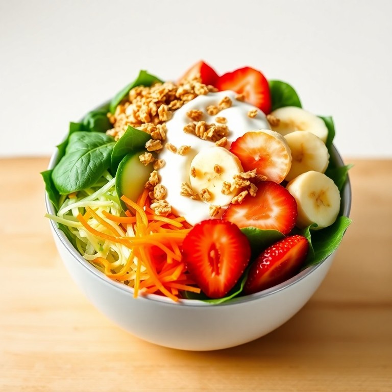 Este bowl energético es una opción perfecta para una colación saludable, combinando verduras frescas, frutas jugosas, yogur semidescremado y granola crujiente. Ideal para reponer energías durante el día.