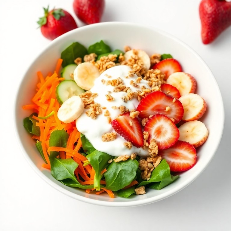 Este bowl energético es una opción perfecta para una colación saludable, combinando verduras frescas, frutas jugosas, yogur semidescremado y granola crujiente. Ideal para reponer energías durante el día.