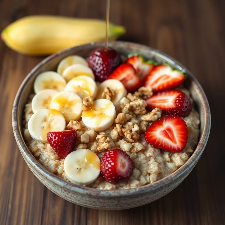 Un desayuno nutritivo y delicioso que combina avena cocida con frutas frescas y nueces, ideal para comenzar el día con energía.
