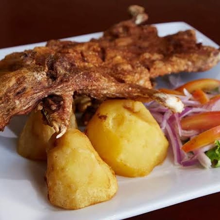 Disfruta de un delicioso cuy frito, crujiente por fuera y jugoso por dentro, acompañado de papas doradas y una ensalada fresca que complementa perfectamente el plato.