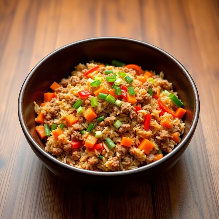 Una deliciosa mezcla de arroz, carne y zanahorias salteadas que combina sabores y texturas en cada bocado. Perfecto para una comida rápida y nutritiva.