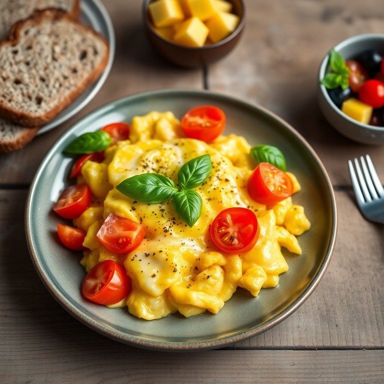 Una receta ligera y equilibrada de huevos revueltos, perfecta para un desayuno nutritivo y delicioso. La combinación de tomates frescos y albahaca aporta un sabor fresco y aromático, ideal para comenzar el día con energía.
