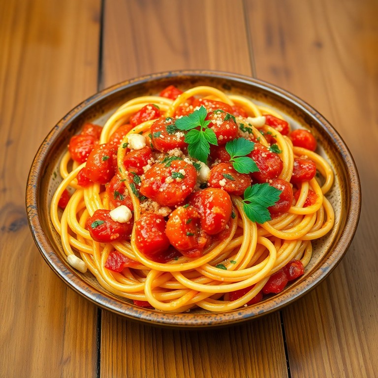 Una deliciosa pasta fresca acompañada de una vibrante salsa de tomate, ajo y orégano, perfecta para disfrutar de los sabores mediterráneos.