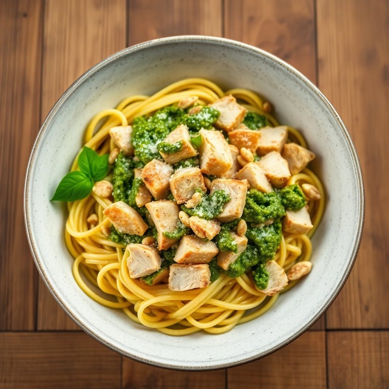 Una deliciosa combinación de pasta y pollo con un toque de albahaca fresca.