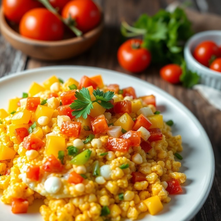 Un delicioso plato de huevos revueltos con pimientos y tomate triturado, ideal para un desayuno nutritivo o una cena ligera. Este revuelto es fácil de preparar y lleno de sabor, perfecto para disfrutar en cualquier momento del día.