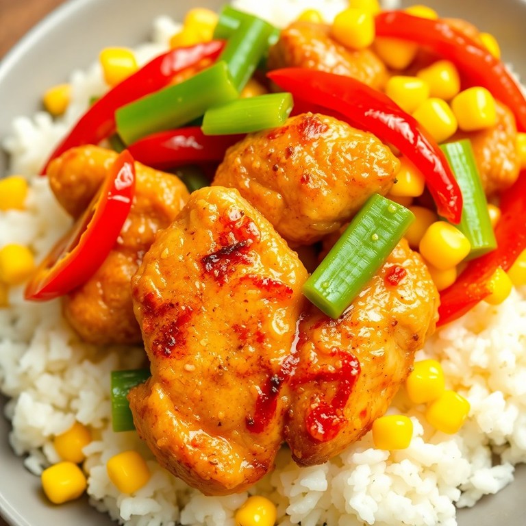 Un plato colorido y lleno de sabor que combina pollo tierno con verduras frescas y elote dulce, servido sobre arroz. Perfecto para una comida nutritiva y deliciosa.