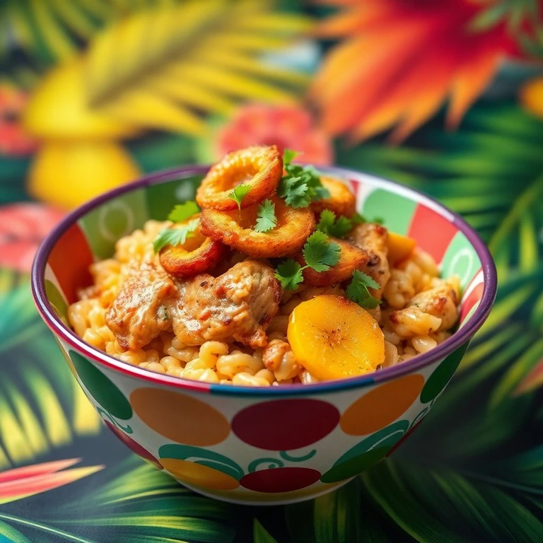 Una deliciosa fusión de sabores caribeños que combina fideos con pollo tierno y plátano frito crujiente, ideal para una comida reconfortante y llena de sabor.