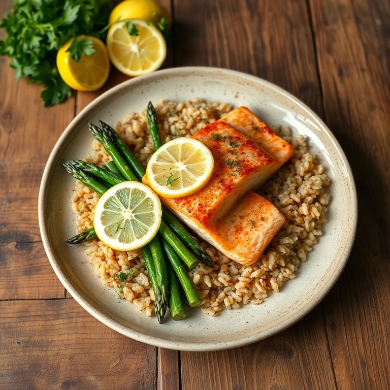 Este delicioso salmón al horno es una opción perfecta para una cena nutritiva, lleno de omega-3 y acompañado de espárragos frescos y arroz integral, ideal para la recuperación muscular.