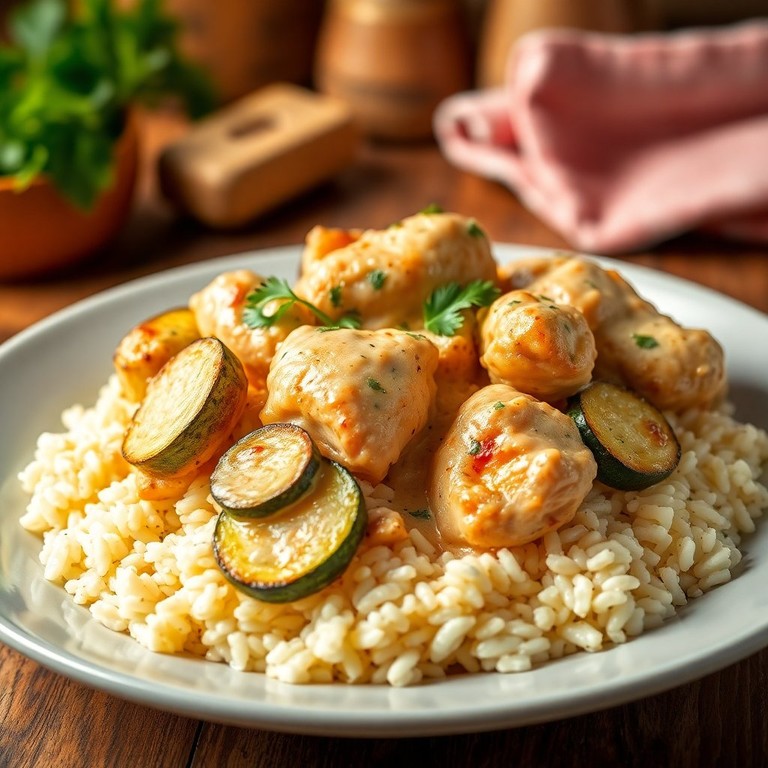 Un plat réconfortant avec du poulet tendre, des courgettes et une sauce à la crème fraîche, parfait pour un dîner en famille.