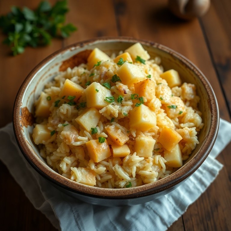 Un plato reconfortante de arroz cremoso con trozos de papa y queso, ideal para disfrutar en familia.