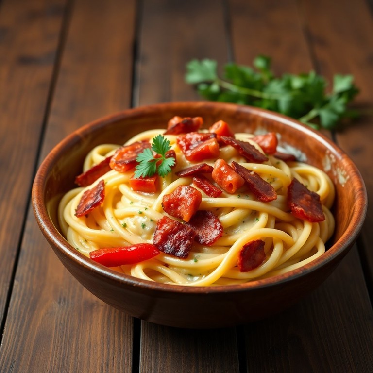 Una receta indulgente de pasta con una cremosa salsa de nata, bacon crujiente y pimientos asados.