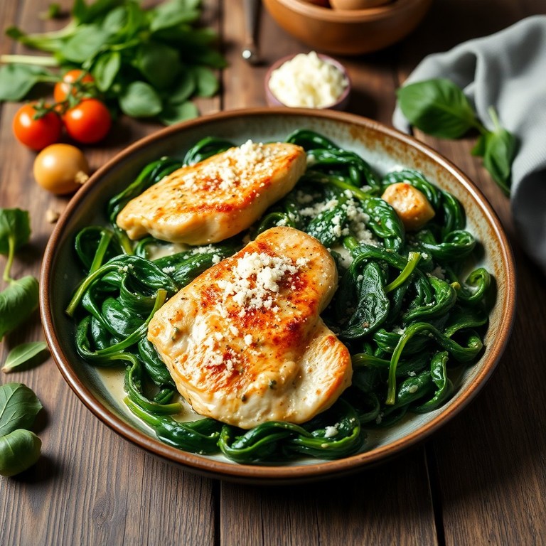 Una deliciosa mezcla de pollo jugoso y espinacas salteadas en una salsa cremosa, perfecta para una cena reconfortante.