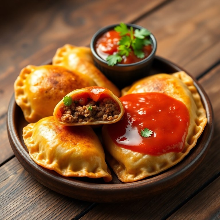 Empanadas crujientes rellenas de carne y acompañadas de una salsa de tomate casera.