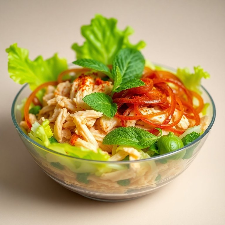 Una ensalada vibrante que combina pollo tierno, lechuga crujiente y cebolla dulce, perfecta para un almuerzo ligero o una cena refrescante.