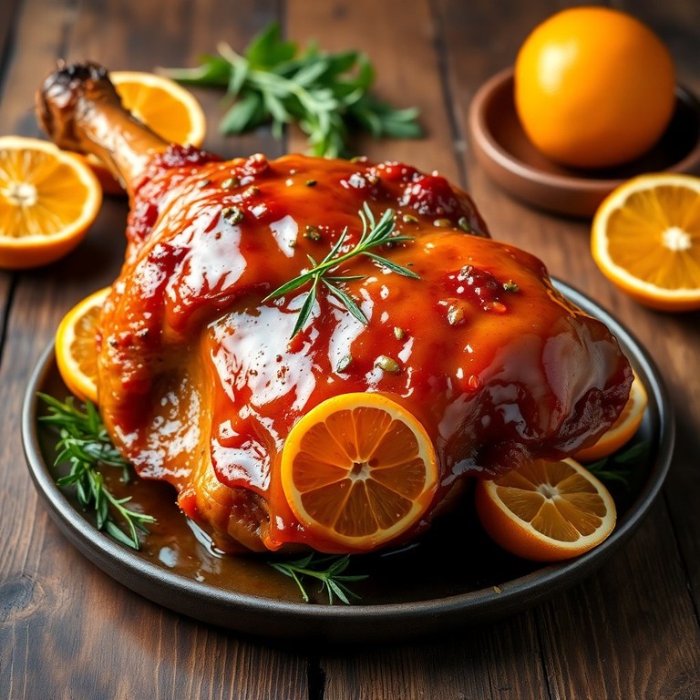Un delicioso chamorro asado con un glaseado cítrico irresistible que combina la dulzura de la miel y el sabor ácido de la naranja, perfecto para una cena especial.