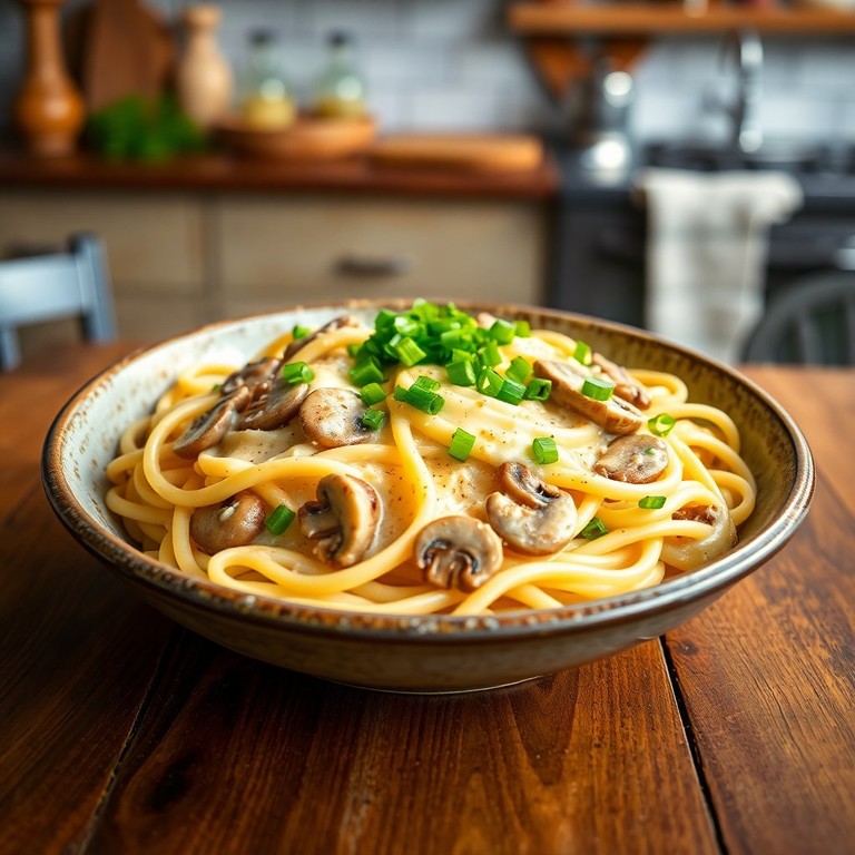 Un plato de pasta suave y delicioso con una salsa de queso y champiñones, ideal para una cena reconfortante.