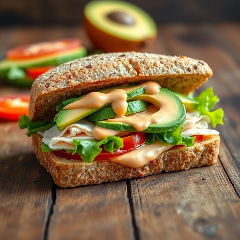 Un sándwich delicioso y saludable que combina la suavidad del aguacate con el sabor ahumado de la mayonesa de chipotle, ideal para un almuerzo sustancioso.