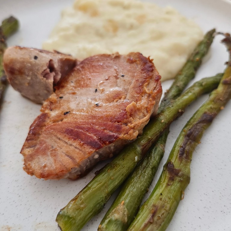 Atún Rojo a la Parrilla con Puré de Papas Cremoso y Espárragos Asados