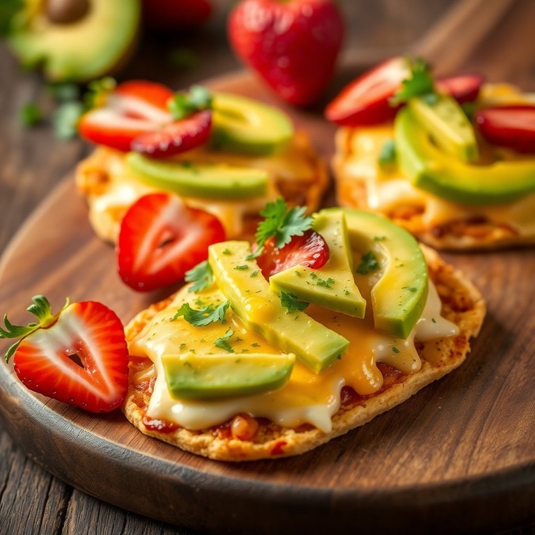 Estas tostadas de queso fundido son una deliciosa combinación de sabores y texturas, perfectas para un aperitivo o una comida ligera. El queso derretido se complementa perfectamente con la cremosidad del aguacate y el frescor del perejil, mientras que las fresas añaden un toque dulce y colorido.