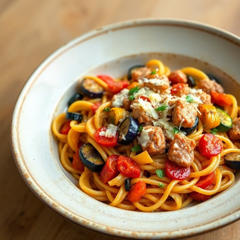 Un plato vibrante de pasta con cerdo tierno y verduras asadas al horno, ideal para una comida reconfortante y llena de sabor.