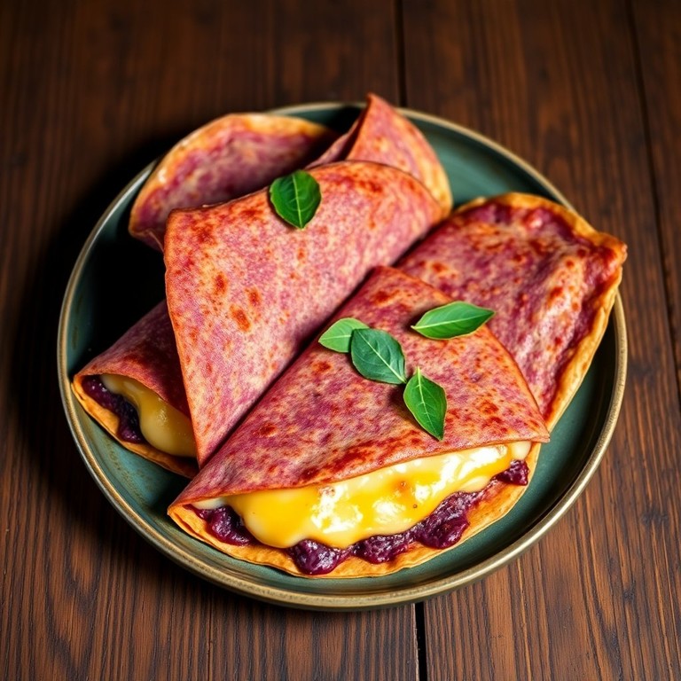 Deliciosas quesadillas rellenas de queso derretido y maíz morado, perfectas para disfrutar en cualquier ocasión.