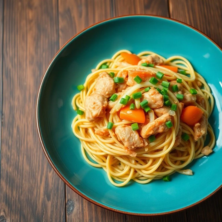 Un delicioso plato de fideos salteados con pollo y verduras, lleno de sabor y color, ideal para una comida rápida y nutritiva.