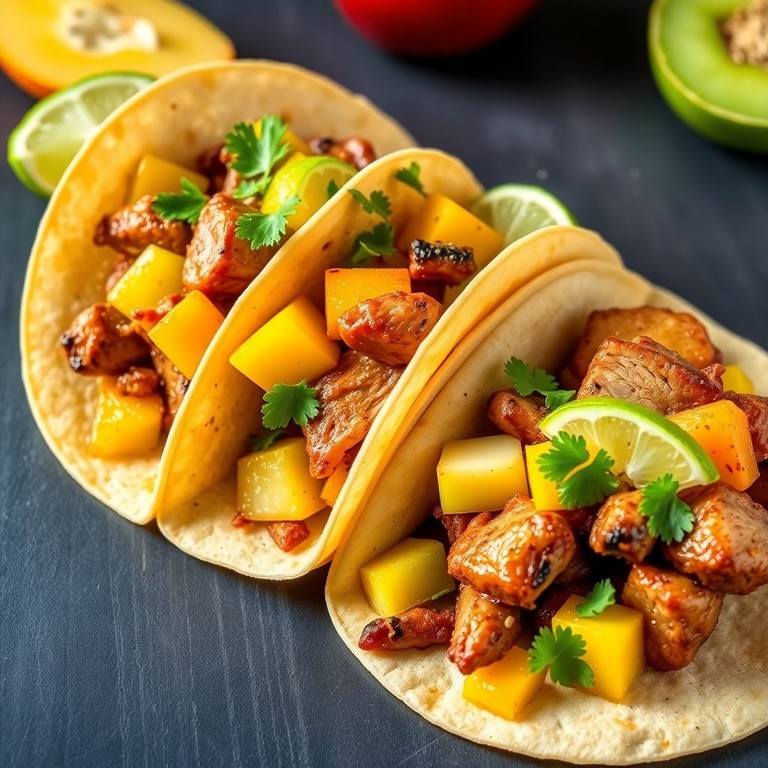 Estos tacos de cerdo son una explosión de sabores tropicales y frescos, combinando la dulzura del mango y la manzana verde con la jugosidad de la carne de cerdo y el crujido de las papas. Perfectos para una comida informal o una fiesta.