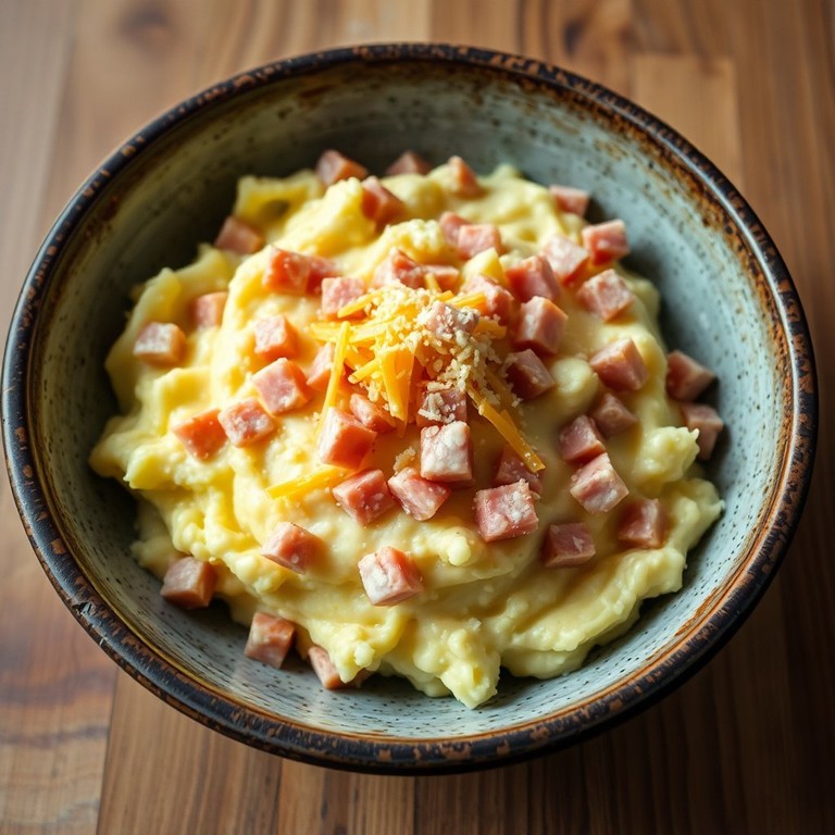 Este delicioso puré de papas está enriquecido con trozos de jamón y queso fundido, creando un plato reconfortante y sabroso que es perfecto como acompañamiento o plato principal.