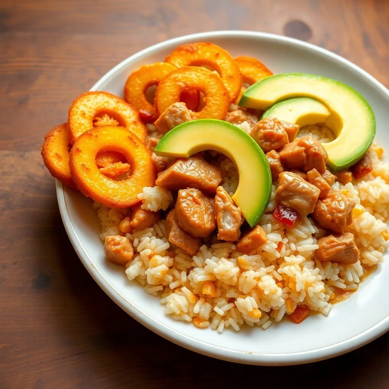 Un plato reconfortante que combina la suavidad del arroz con la carne de cerdo jugosa y el dulzor de los plátanos fritos, ideal para disfrutar en familia.
