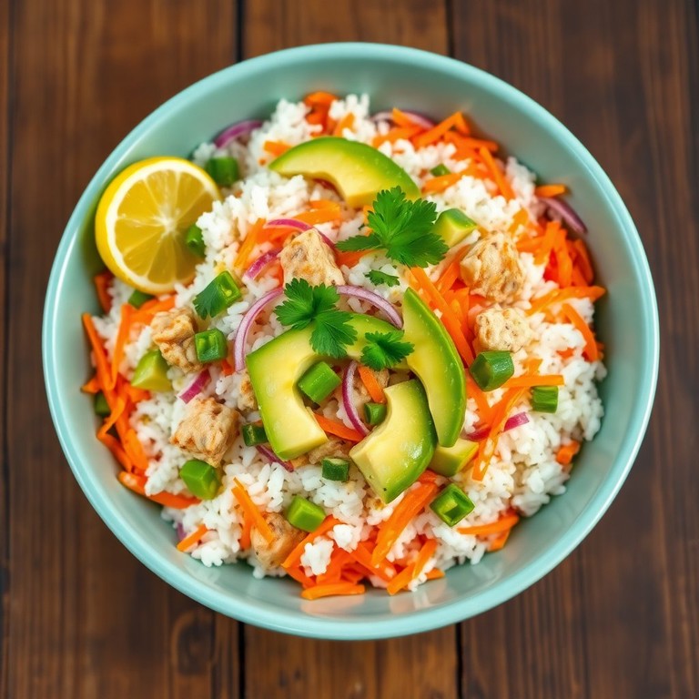 Un plato ligero y refrescante con un toque de limón, ideal para un almuerzo o cena rápida. La combinación de arroz, atún y aguacate crea una mezcla deliciosa y nutritiva que es perfecta para los días calurosos.