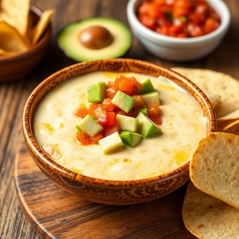 Un delicioso dip de queso derretido acompañado de aguacate y salsa fresca, ideal para compartir en reuniones o como aperitivo.