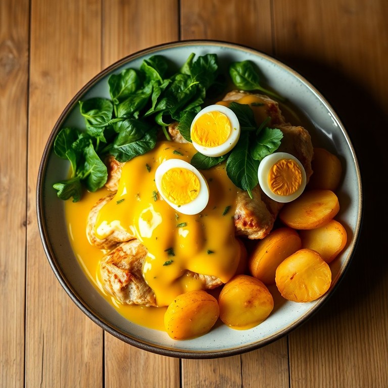 Delicioso pollo bañado en salsa huancaína, acompañado de espinacas y papas.