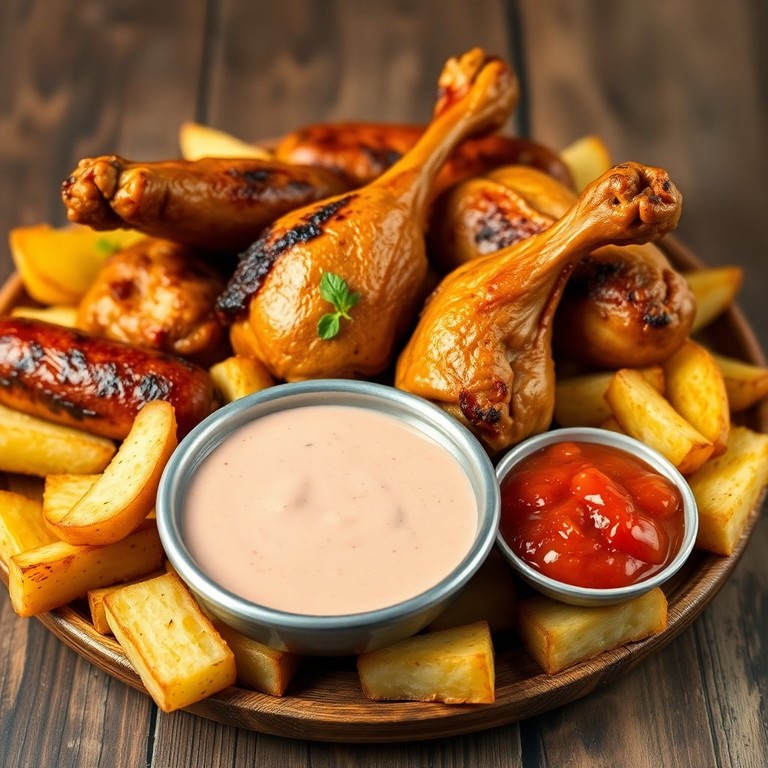 Un plato reconfortante y lleno de sabor, ideal para compartir. Perfecto para una cena familiar o una reunión con amigos, este plato combina la jugosidad del pollo y las salchichas con la textura crujiente de las papas doradas.