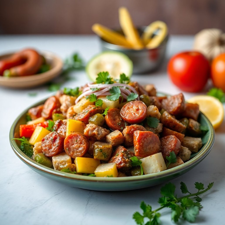 Salteado de Chorizo, Carne y Plátano con Verduras Frescas