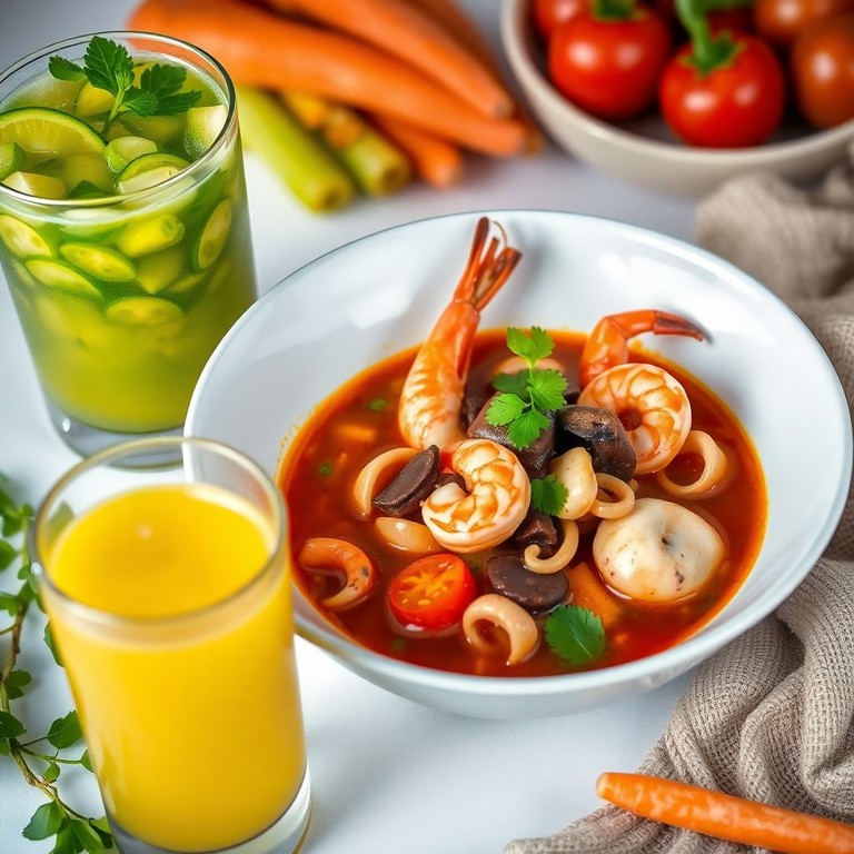Sopa de Mondongo con Mariscos y Jugo de Verduras Saludable