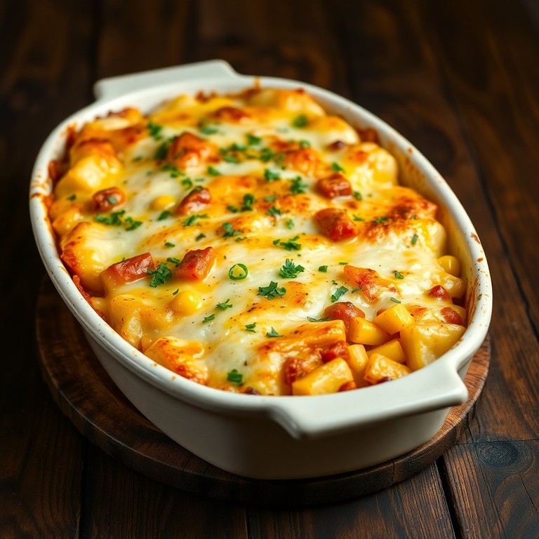 Gratinado de Papas, Queso y Chorizo con Maíz
