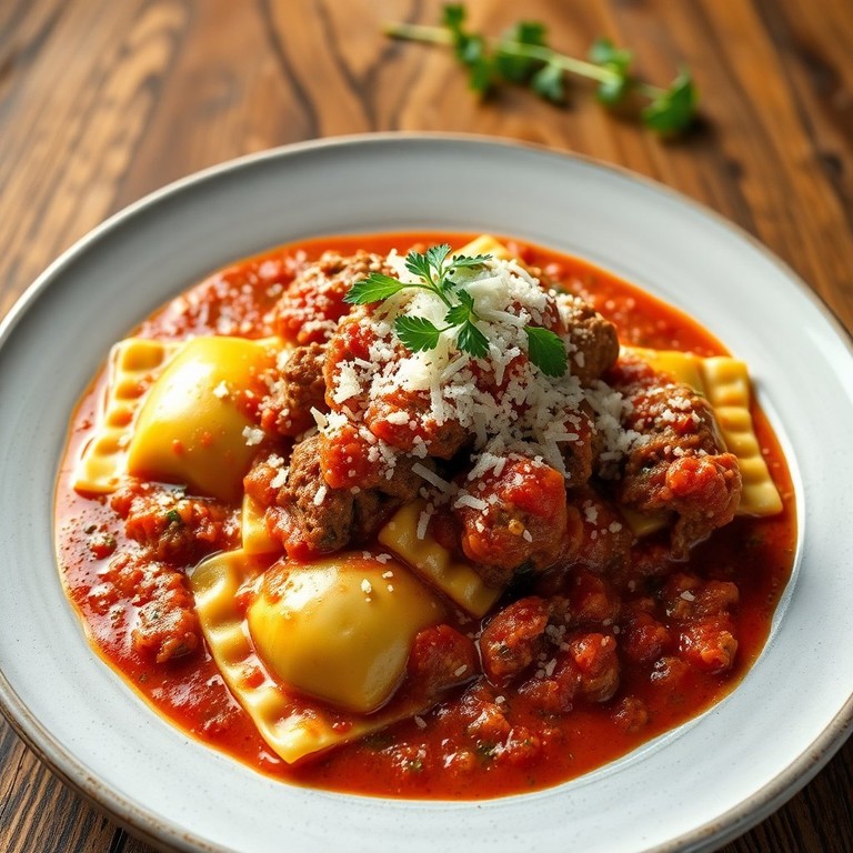 Una deliciosa receta italiana que combina ravioles rellenos de costilla de res con una salsa de ragú tradicional, perfecta para una comida especial. El toque de queso parmesano le da un sabor irresistible.