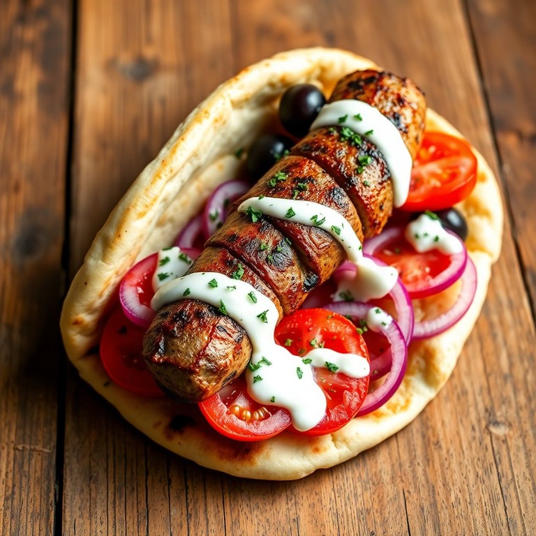 Un festín mediterráneo lleno de sabores frescos y vibrantes, ideal para disfrutar en una comida ligera o como aperitivo. Esta pita combina la jugosidad de la salchicha de souvlaki con la frescura de los vegetales y el cremoso tzatziki, creando una experiencia deliciosa y satisfactoria.