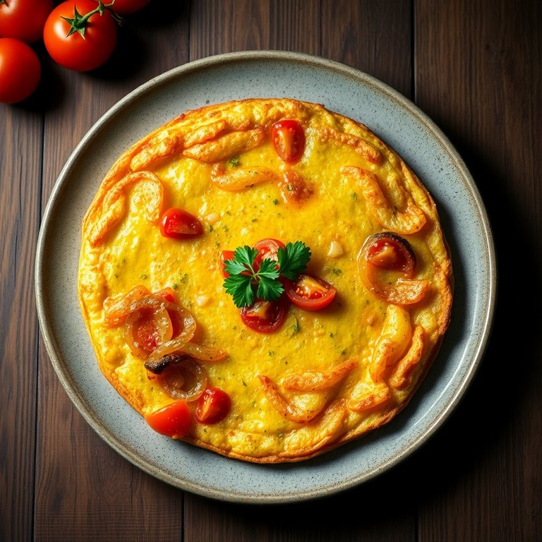 Una deliciosa tortilla de patatas con un toque de cebolla y tomate, perfecta para cualquier comida.