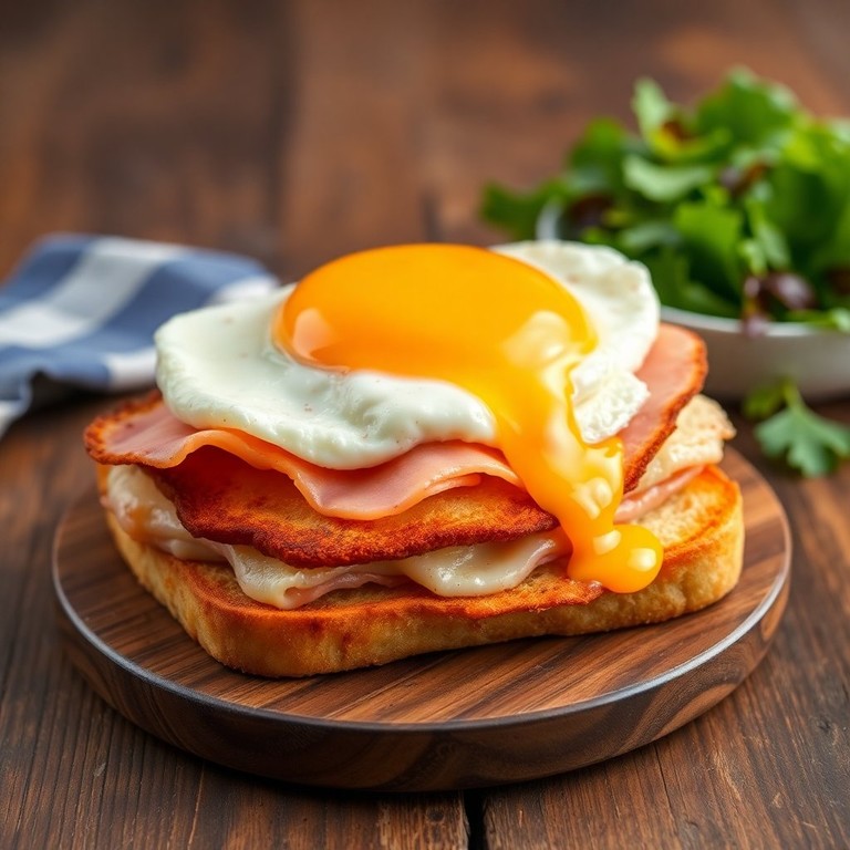 Un sandwich savoureux garni de jambon, fromage et œuf au plat, le tout enveloppé dans du pain frit croustillant.