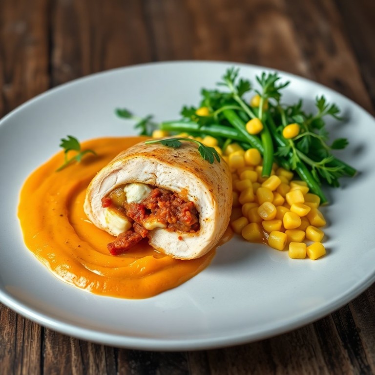 Deliciosa pechuga de pollo rellena de chorizo y queso cremoso, acompañada de puré de batata y puré de papa y calabaza, perfecta para una cena especial.