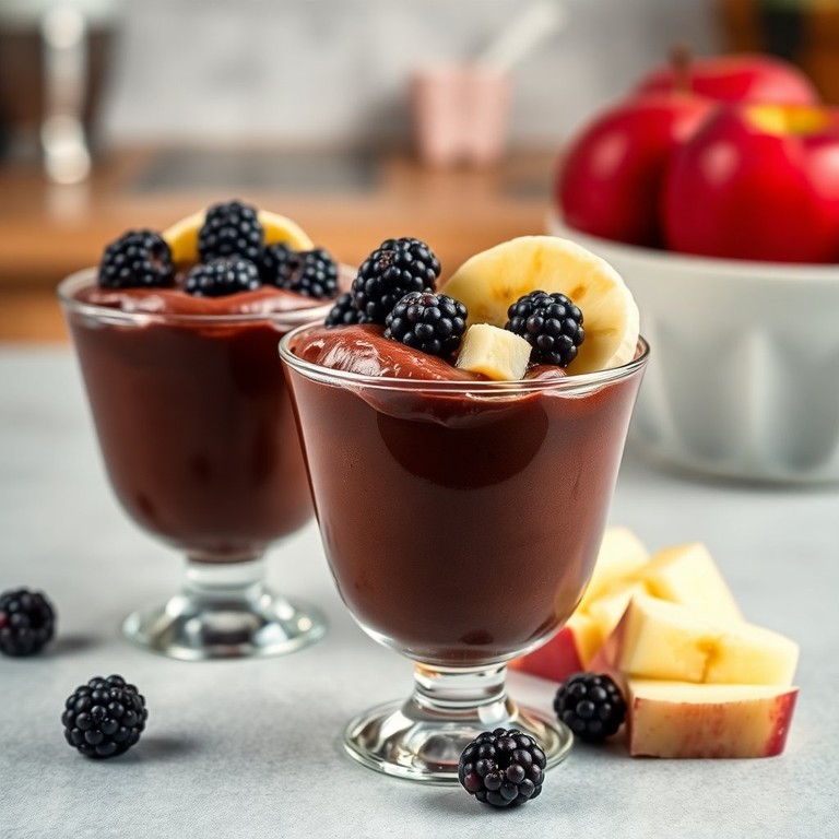 Un mousse suave de chocolate negro acompañado de frescas moras y plátano, ideal para un postre elegante y delicioso.