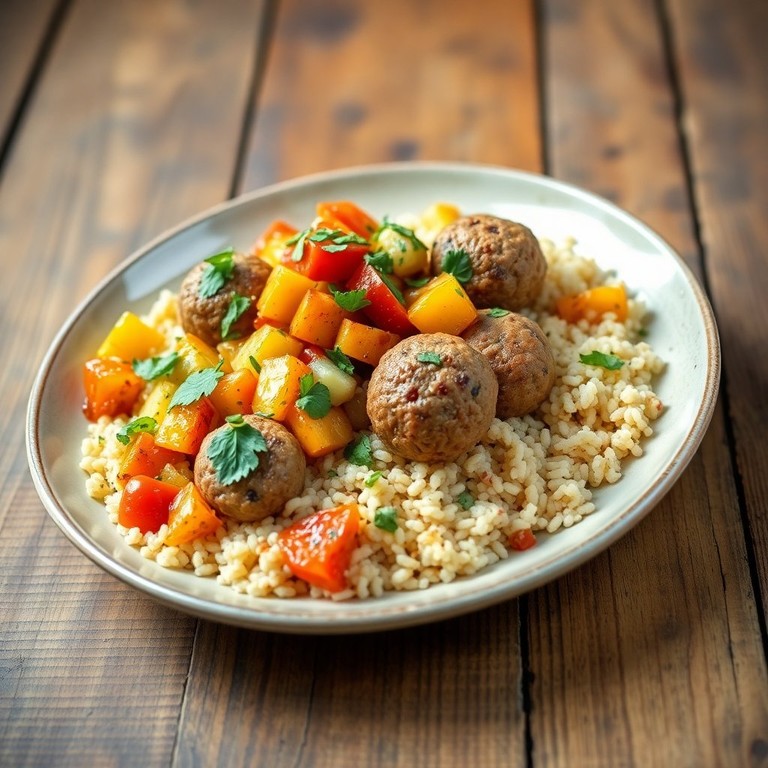 Un plato nutritivo y colorido que combina bulgur esponjoso con albóndigas de lentejas llenas de sabor y verduras asadas, ideal para una comida saludable y deliciosa.