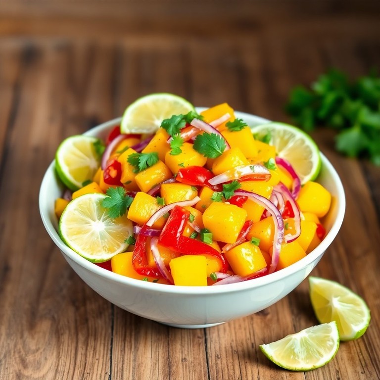 Una ensalada refrescante de mango que combina la dulzura de los mangos maduros con el crujiente de la cebolla roja y el pimiento, todo realzado con una salsa de limón dulce y ácida.