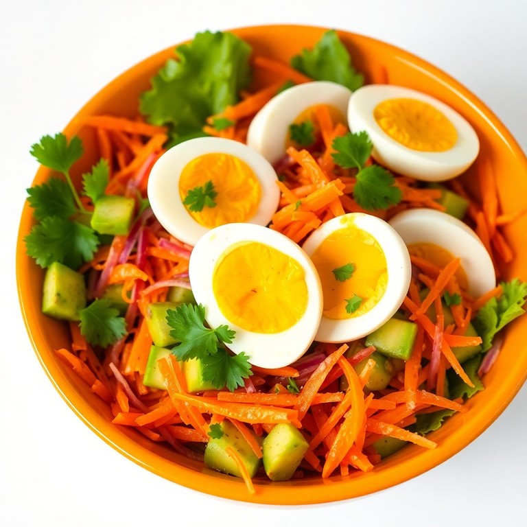 Una fresca y nutritiva ensalada perfecta para cualquier comida, combinando la cremosidad del aguacate con la proteína de los huevos y la frescura de las zanahorias.