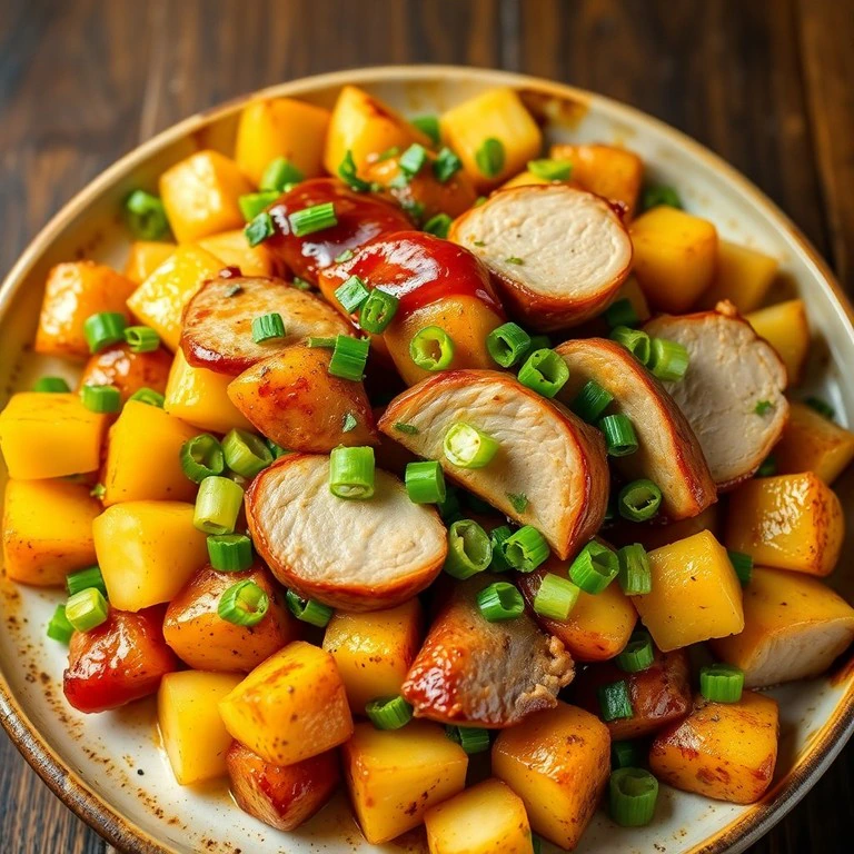 Una combinación perfecta de texturas y sabores en un solo plato, donde las papas doradas se mezclan con el lomo de cerdo tierno y el frescor del cebollín.