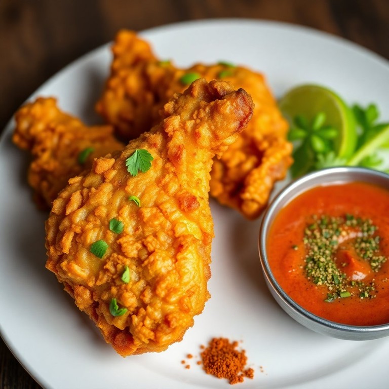 Este pollo frito es dorado y crujiente, sazonado con una mezcla de especias secretas que le dan un sabor irresistible. Perfecto para una comida familiar o una reunión con amigos.