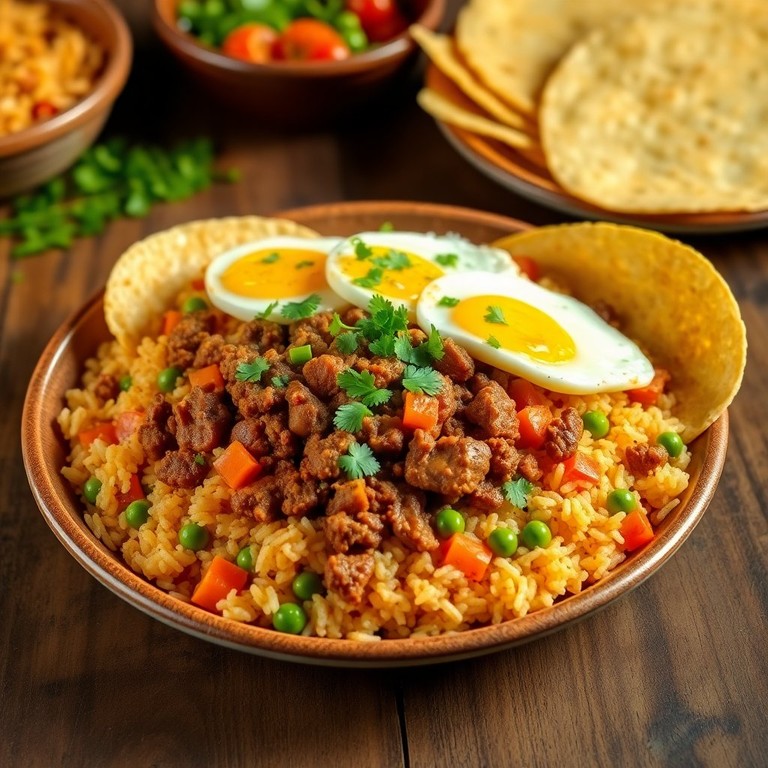 Un delicioso y completo plato de arroz sazonado con carne molida y huevo revuelto, ideal para un almuerzo nutritivo y lleno de sabor.
